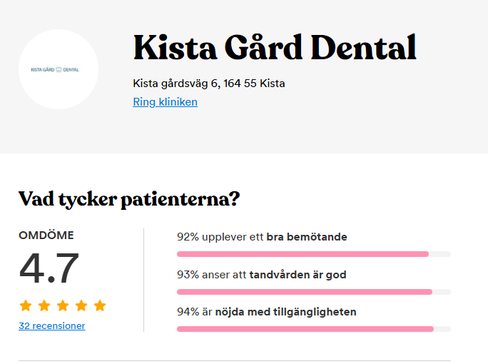 Jaenette S2025-02-07World class dentist would recommend I initially went to another emergency dentist in the city. We waited 45 minutes and realised we could wait many hours to see a dentist so my sister called this local dentist instead. I am so glad she called Kista gård dentist! They were lovely and well equipped. The practice itself looks newly renovated and the dentist is very knowledgeable and skilled. She saw the problem straight away and fixed it pain free. I would highly recommend this dentist as it’s nowhere near the waiting time in the city. Thank you kindly for your help!