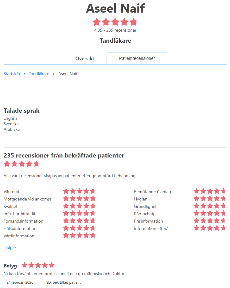 Sumbul Khalid2025-11-13Dr Azil and Dr Kashfah were careful, skilled and very pleasant. Simply the best dentist I've ever been to in Stockholm.